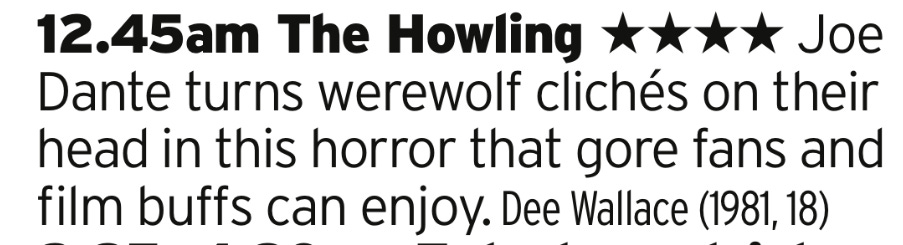 One from the period where werewolf transformations were apparently the coolest thing in the world; you had this, An American Werewolf In London and the opening of Thriller. This is probably at the bottom of that list, depending of your opinion of Michael Jackson that is, but is still a great film.