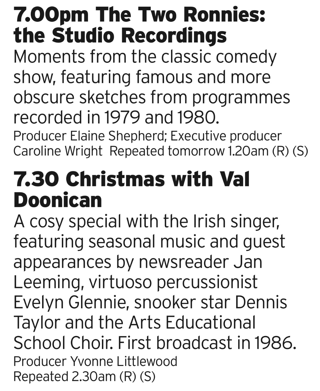 Some more classic TV fare from the BBC; the studio recordings are quite interesting, a nice little sneak behind the unedited curtain. There’s nothing crazily eye opening but its fun to see the camera crew and that getting ready to film something that would end up in front of millions of people. And a 1986 Christmas Special? With Val Doonican? No clue who it’s for but I’m sure it’ll go well with some Quality Streets