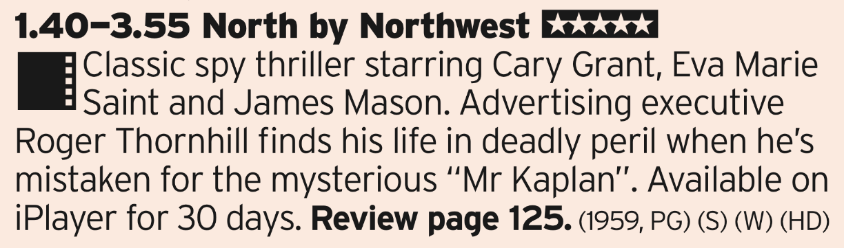 More classic cinema, here you have the best of Hitchcock’s big budget fare from the 1950s. Is it the best? Yeah, it probably is, especially for Christmas Eve afternoon. Some truely iconic scenes, the most laid back Cary Grant performance and a top drawer score. I’ll have this with a full plate from the Christmas buffet, thank you