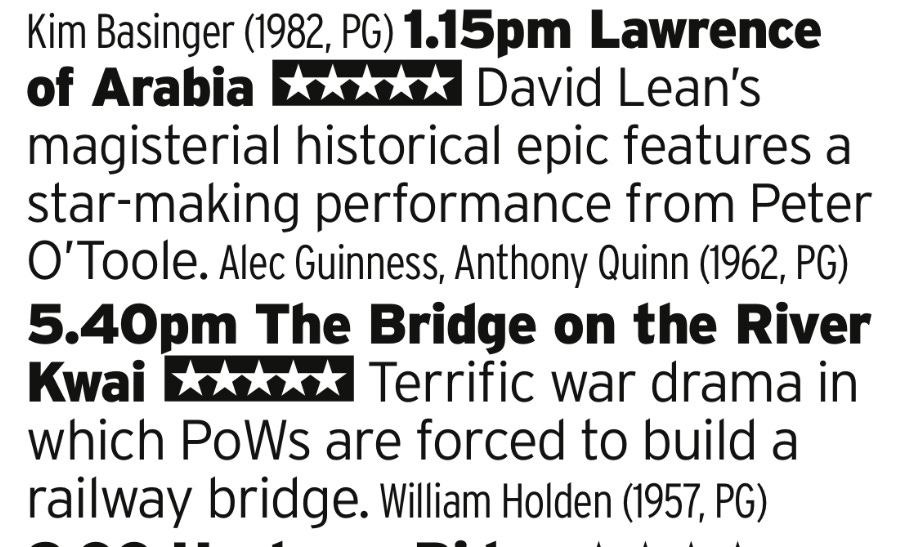 A big old David Lean double bill here, full of amazing performances with an extra bucket of epic cinematography for you on the side. Not sure why they’ve got them the wrong way around but never mind. Settle in the for long haul or pick your flavour; a widescreen epic with plenty of homoerotic undertones, or a distillation of English obsession whilst building a big old bridge