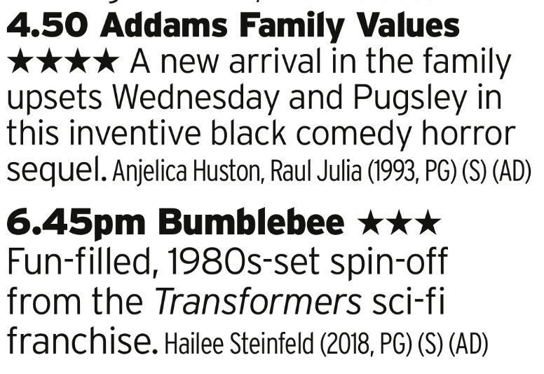 A lesson in sequels here; Addams Family Values showing how you make a sequel to a really good film, which is mainly getting the same people back and letting them do their thing. Then Bumblebee showing how you make chicken salad out of chicken shit, said poultry excrement being the Michael Bay live action Transformers films. Arguably, they did a lot of the work by casting John Cena but thats a conversation for when F9 pops up on one of these