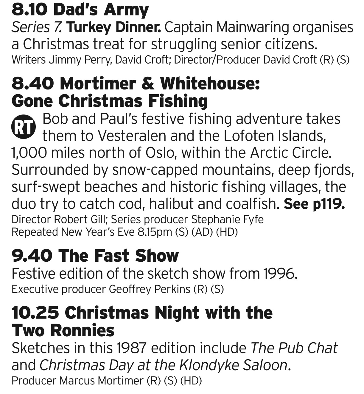 More Christmas Specials! The middle two are probably the most interesting, forming a delicious Christmas TV sandwich with the older shows being the bread. But like, real nice bread. The Fast Show is one I’ve got my eye on, the specials generally played around with the format of the sketches so for someone coming to it new the jokes may not land but it’ll hopefully still be as good as I remember that show being. Remember that? When sketch shows rules the world? Halcyon days.