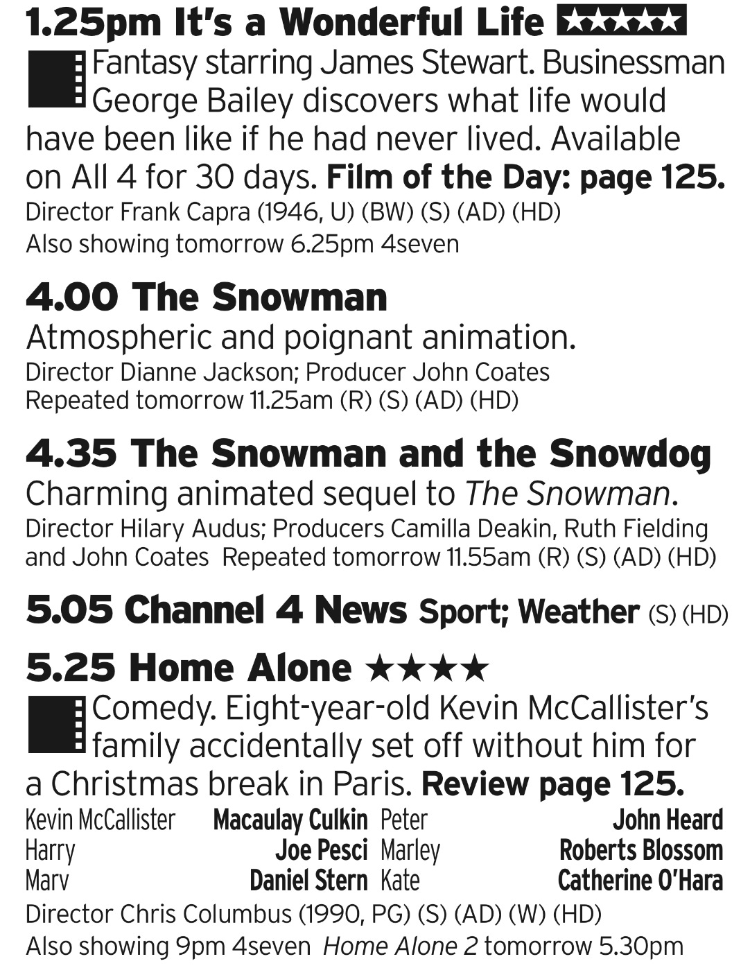 Its route one stuff here from Channel 4, one might even say lazy, but you can’t argue with the results here; its Christmas classic after Christmas classic from lunch till tea time. If you’re having people round its probably your best bet if you want something on in the background