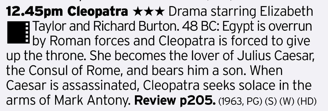 The ultimate folly of Golden Age Hollywood, where the story of the making of the film is probably better than the film itself. It had a huge cast, thousands of extras, all the money is on the screen so perfect for a Bank Holiday afternoon