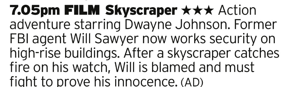 Its getting late in the day so must be time for a big dumb film starring The Rock. Whats that? He’s in a skyscraper that gets set on fire and there’s a heist involved? Awesome, hand me those Roses and lets go