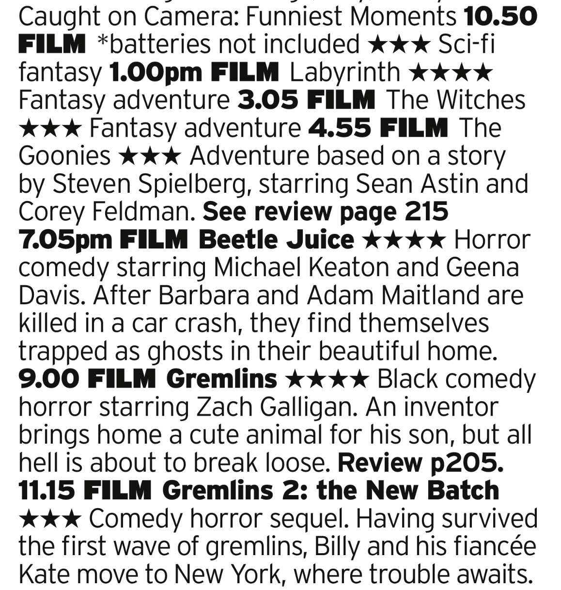 For a run of films on a Bank Holiday, this list has to be near flawless. I mean look at it; twee 80s sci-fi, then 2 kids films that try really hard not to be kids films, then the definitive 80s kids sweary caper film, then Beetle Juice and then both Gremlin films. Both of them! 12 hours of film fun fully laid out for you, an outstanding piece of TV scheduling and a great way to start the new year