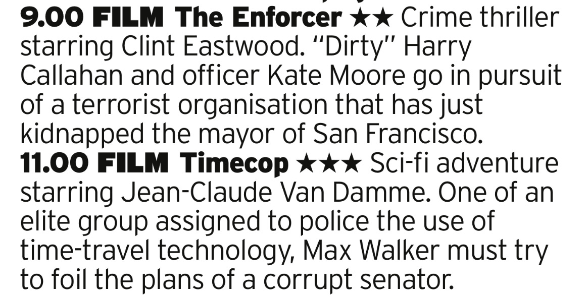 I do enjoy these run of films where you see a Dirty Harry film paired with one of its descendants. The Enforcer is where the barrel was started to be scraped so it’s not a fair comparison, also the loose canon cop in the modern film is of the sci-fi variety with a good dash of Lethal Weapon’s Riggs tragic backstory. Maybe Dirty Harry should have travelled through time? That would have been good.