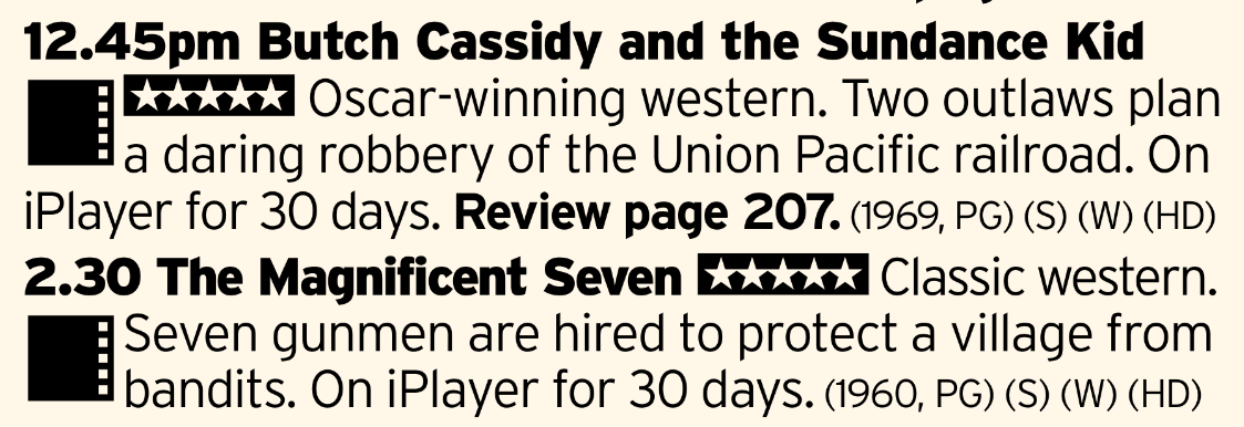 A genuine 5 star double bill here, with two of the definitive westerns. What makes this really great is that the two are made at either end of two eras; Seven is at the tail end of the classic Hollywood period so still has that John Ford vibe to it, then Butch Cassidy is at the start of the New Hollywood era so has much more of a counter culture vibe. A rootin tootin treat!
