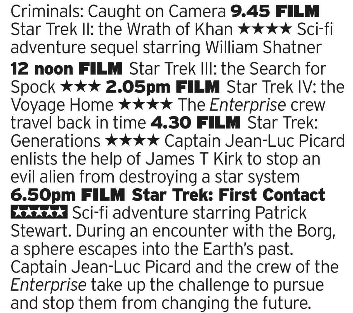 Initially when I was getting the details together for today I saw First Contact and was like “oh, that’s a belter” so that made the list. Then once I have a title I check before and after just to see if there’s a double bill or anything, so then I saw another Star Trek on before it, then another before then before I knew it there was a whole day of Star Trek films! Not a bad selection either, having the trilogy of II, III and IV is a proper treat, then 2 that would probably have made better TV episodes, then the aforementioned First Contact which is a stunner! What a treat!
