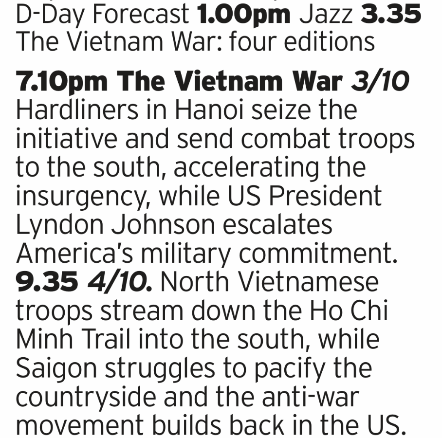 As an Old Dad getting older by the hour, a whole afternoon of a Ken Burns documentary about The Vietnam War speaks to me. Just the kind of show to settle down to with a box of Roses and then fall instantly asleep before the opening credits finish.