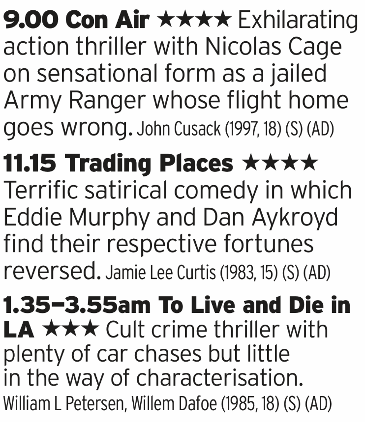 A superb triple bill from Film4 here; starting with an absolute banger, a fever dream of mid 90s action excess fired at you with the sheer force of a pumped up Nic Case. Trading Places remains one of the great comedies of the 80s, and then To Live and wait a second, they only gave it three stars?! Thats a crime. Arguably Friedkin’s best of the decade, its a belter of a crime film. Honestly, its great, watch it!