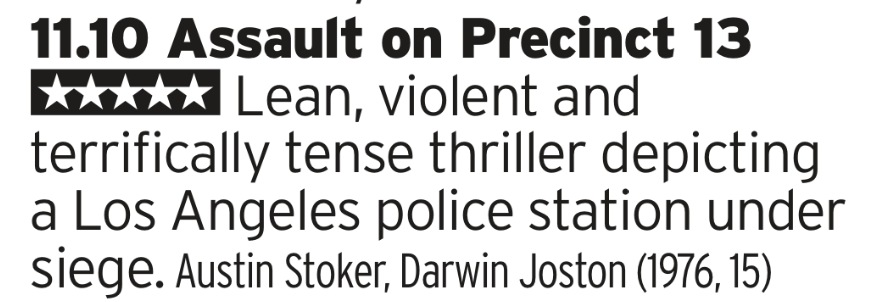 I beg your pardon? The original Assault on Precinct 13? The John Carpenter one? That one? Aaah, thats brilliant! Too often when I see this title its the rubbish new one so its cracking to see this one get a run out on TV. And what a soundtrack!