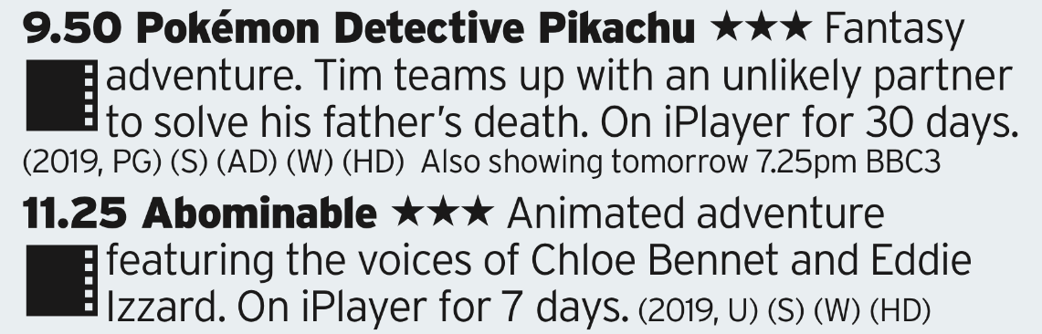 See, I quite enjoyed Pikachu when I saw it at the cinema but then a year later we had the Sonic film which was a bit better? I mean, really, when you get down to brass tacks it was Jim Carrey that made that film if we’re all honest. Pikachu doesn’t have anything like that so its just not quite as good. And for Abominable? Not seen it, but I remember the reviews being good so its probably worth a go