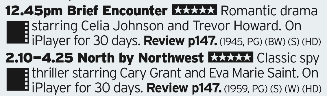 Good Lord thats a couple of brilliant films there, back to back. Brief Encounter remains heartbreakingly romantic despite its age, I guess some themes are universal and will probably last forever. And North by Northwest is just the definition of A Cracking Romp, all Cary Grant being cool and spy plots going on all around him. A superb double bill this