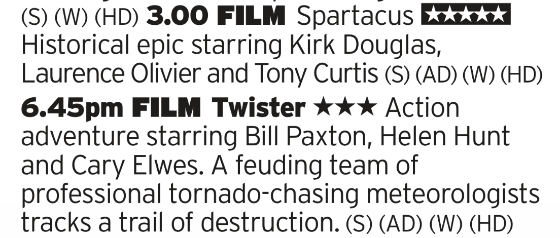 Wow, what a tonal shift this one is; big budget classic Hollywood in 1960, then mid 90s special effects nonsense with Twister. I mean, we all know that Spartacus is the better film, but does it have a cow thrown through the air by a massive tornado? Exactly.