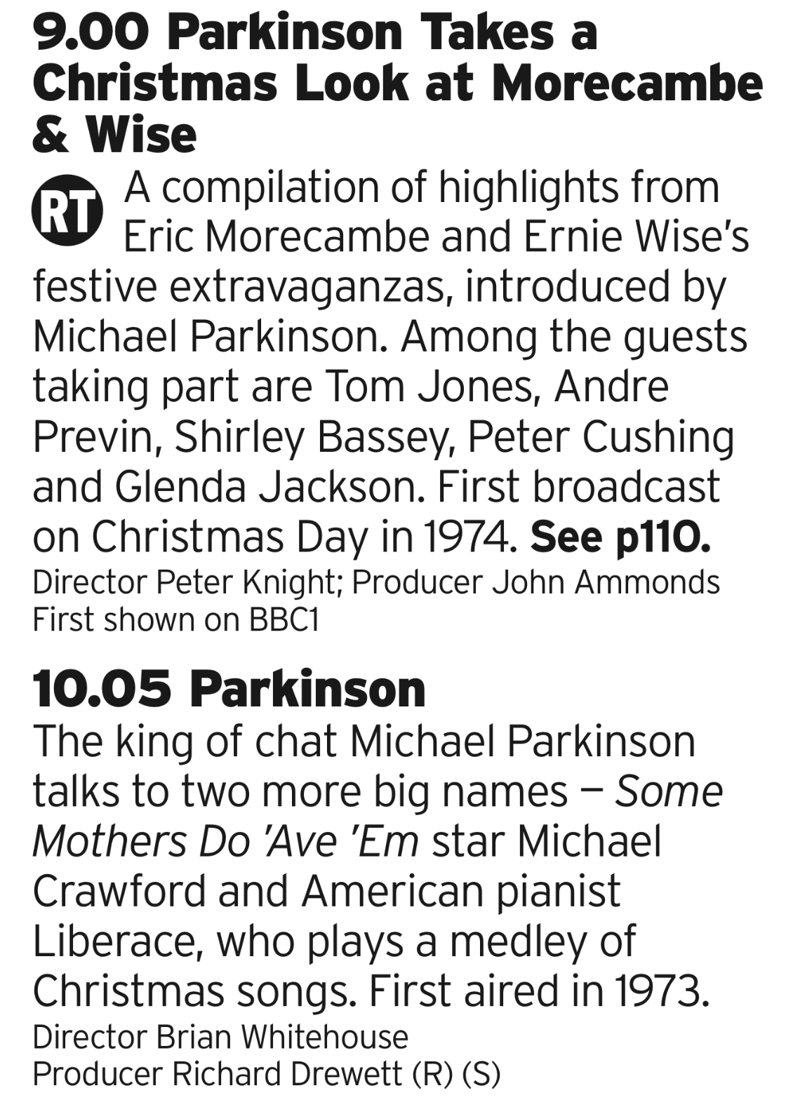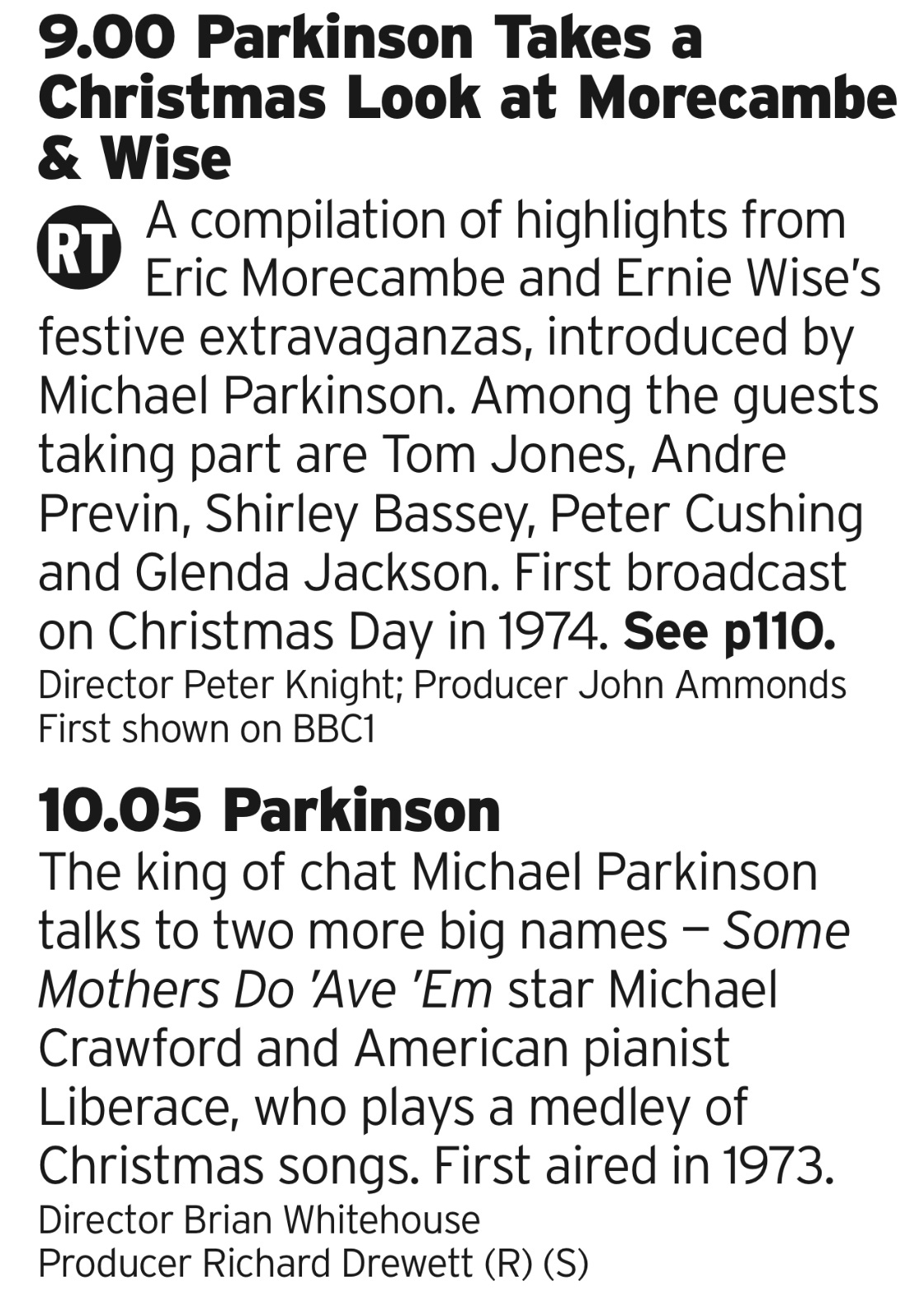 Here’s an interesting couple of shows, both from Michael Parkinson back in his 1970s pomp. The first is basically a Morecambe and Wise clip show, which isn’t exactly the worst thing in the world and as its post their really good Christmas shows the clips should be really good. And then a random episode of Parky with Liberace which should be an interesting one