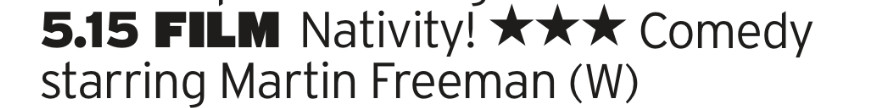 Its a route one idea for a Christmas film (a bunch of cute Junior School kids putting on their Nativity show) but it works thanks to Martin Freeman holding things together. Now, Marc Wootton very brings the whole thing down playing a very irritating character but then its best to realise that thats actually the point of his character and just go with it. Its one of those films, just go with it and it’ll be fine