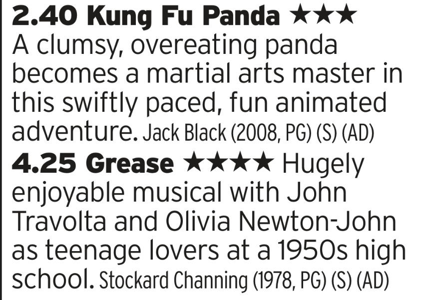 Another good back to back Family Double Bill, out of the 2 I’d take Kung Fu Panda which is I think due to Grease being everywhere when I was a kid. I remember it being on TV one Summer Holiday, then the Grease Megamix hit the charts and that was it ruined. Kung Fu Panda has a kung fu panda in it which makes it the superior film