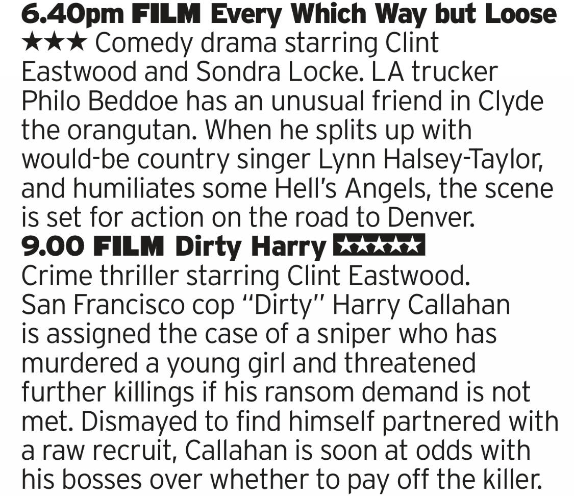 Do you want a Clint Eastwood double bill? Well here you go, Comedy Clint and Action Clint. Even though, to be fair that those 2 versions of Clint aren’t exacly a million miles away from each other. Give Dirty Harry an orangutan for a partner and you’d have pretty decent comedy without too much effort. Man, that would be awesome.