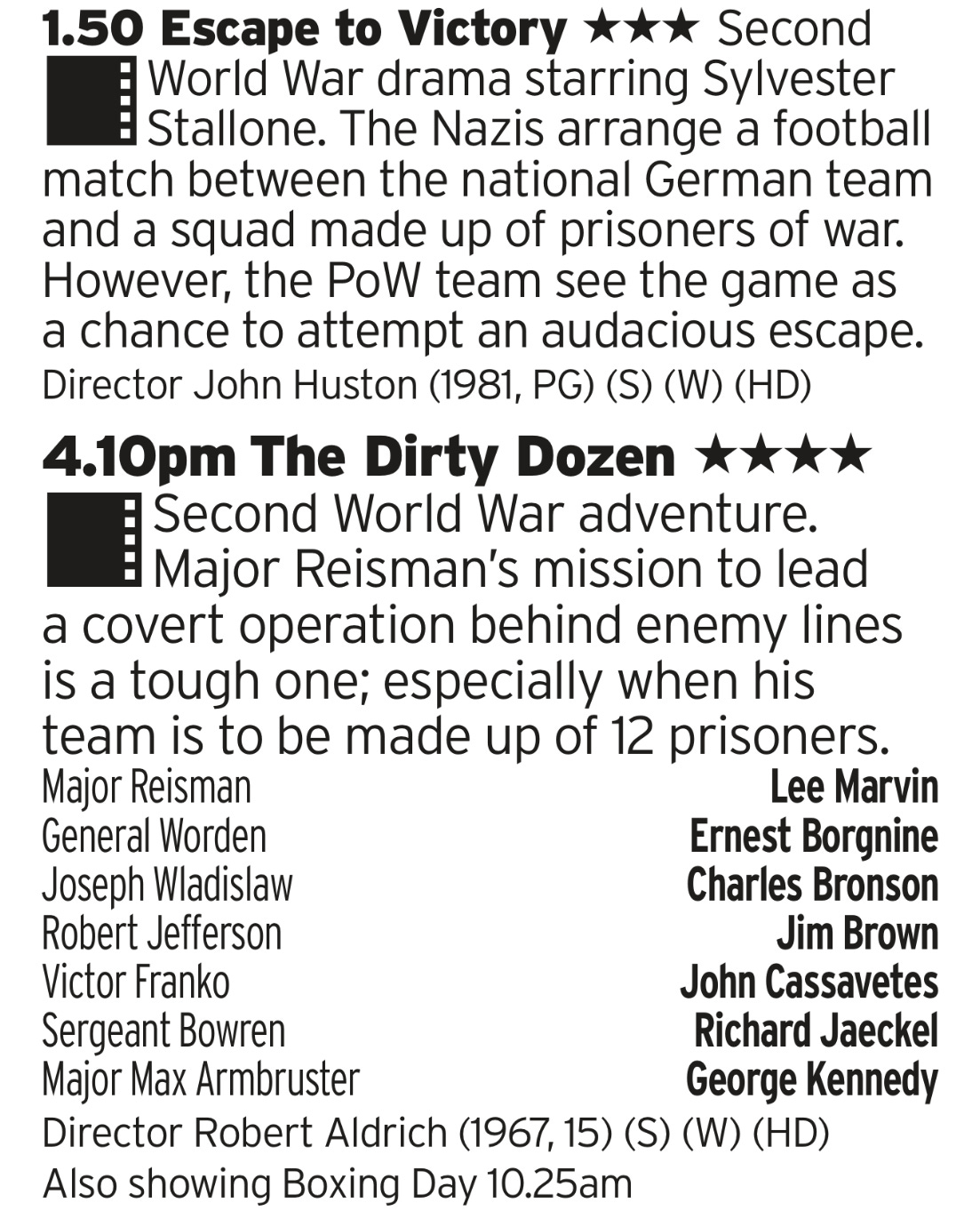 Not sure if Christmas Eve Eve counts as a Bank Holiday but guessing it must do to someone which is why we’ve got these 2 films on the docket. Escape to Victory is good, especially if you want to get a sports fan to watch a film, but The Dirty Dozen is the superior film. Lee Marvin is really underrated despite being in some belters, and this is one of the films that really supports that argument. He leads a great cast of convicts and ne’er-do-wells as they go kill a bunch of Nazis rather than rot in military prison.