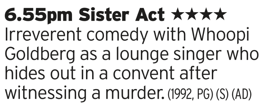 Can’t argue with this; Whoopi Goldberg on the run from the mob, having to hide out with a bunch of nuns in a run down San Fransisco neighbourhood? Nuns who sing? And they all become amazing pals whilst Harvey Keitel tries to hunt her down using corrupt police contacts? Films are mad sometimes.