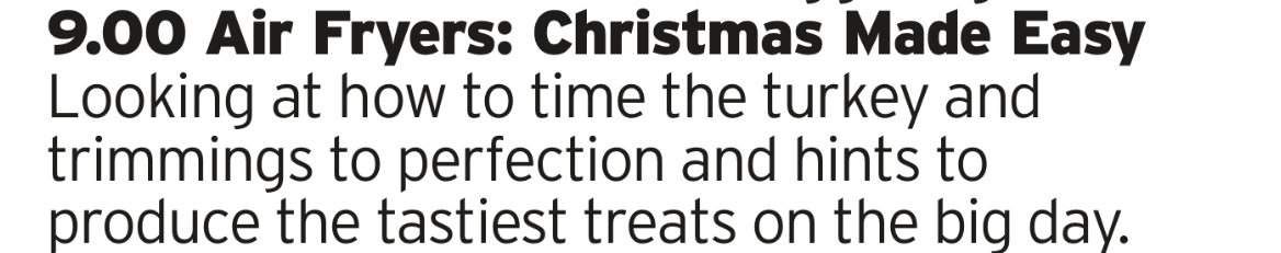 Look, I’m not one to recommend any old rubbish for the Christmas TV Strategy Guide, the whole idea is to pick out the cream of the crop or the hidden diamonds that are worth checking out. But here we have an hour long (hour long!) cooking show about air frying your Christmas dinner. Its probably going to be rubbish, but you have to admit you’re strangely compelled to watch it right? Because that was my emotional journey when I saw it in the schedule