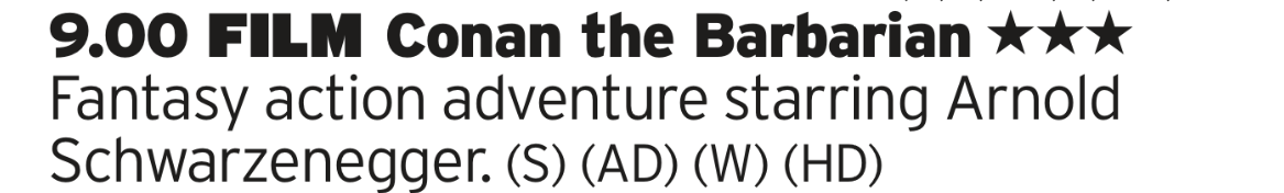 Time for an early Arnie film, with the Austrian Oak firmly in the ‘don’t let him talk too much’ period. But thats okay here as he has massive muscles with even massiver swords to swing around so we’ll let him off on the lack of banter.