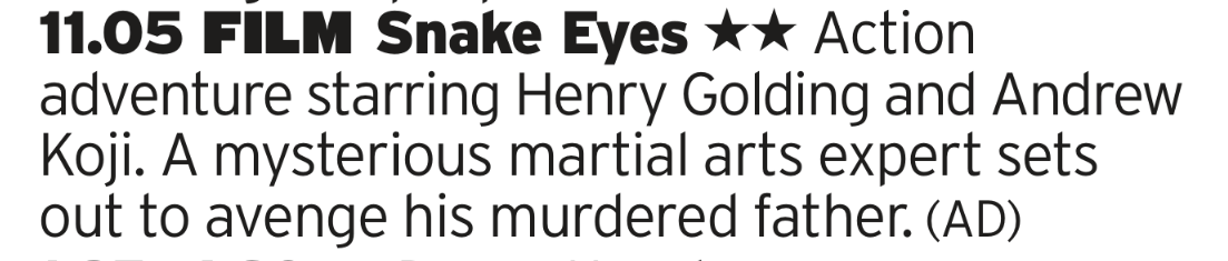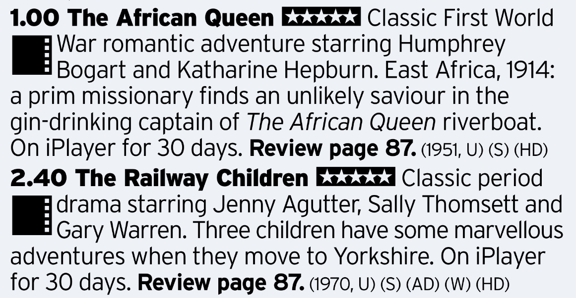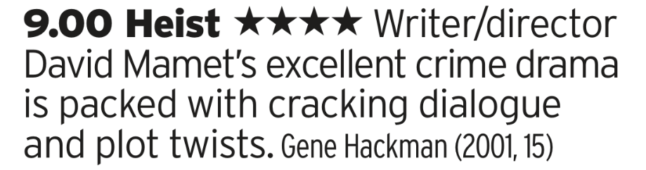 Having a channel called Great Movies opens you up to all kinds of comments when you you show a movie that isn’t actually great, but here they live up to their name; its a cracking, well, heist films with plenty of twists and turns and Gene Hackman being as good as he’s ever been. Also keep an eye out for one of the best ever ‘just about to kill the bad guy lines’ you’ll ever see