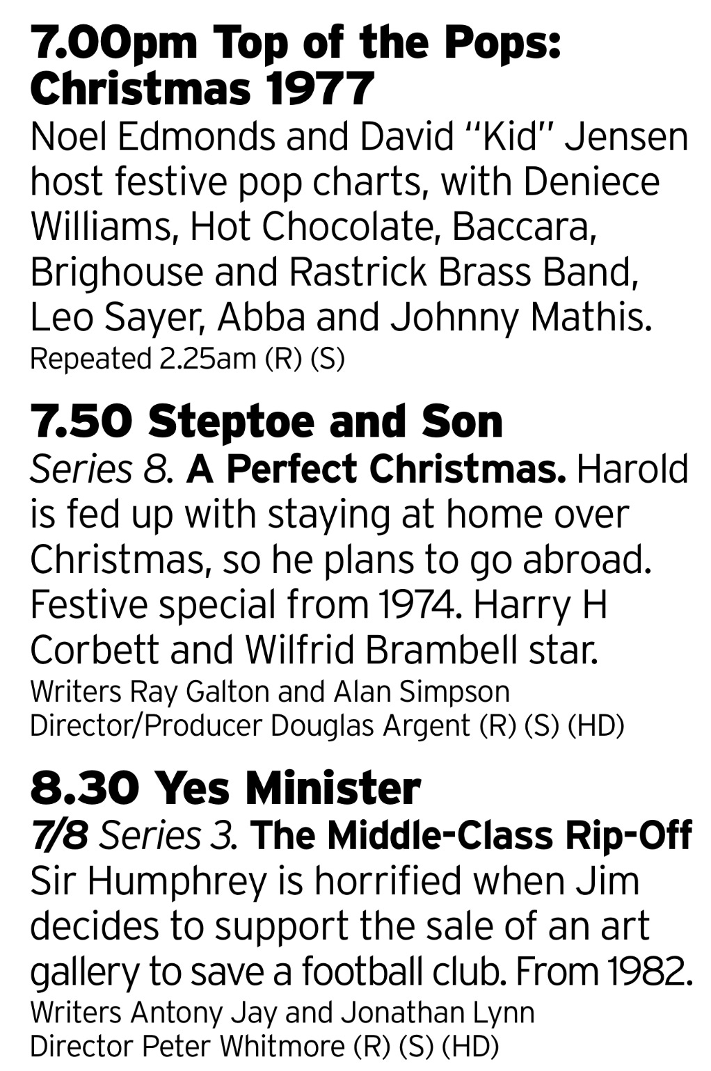 BBC4 continues its mad run of old timey Christmas Specials, this time bringing out Steptoe and Son and Yes Minister. You do wonder, when they’re picking out old Top of the Pops if they have a list of shows that they really properly cannot air again and how many times they check it before loading up the tape for broadcast. Could you imagine they put in the wrong one?