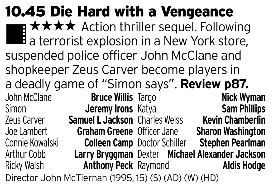The best, and indeed last, of the Die Hard sequels. Honestly, this is such a good film that probably peaks with the stunning taxi car chase through Central Park. A great villain helps things tick along as does the excellent banter between Willis and Jackson. It was good that they didn’t make any more after this