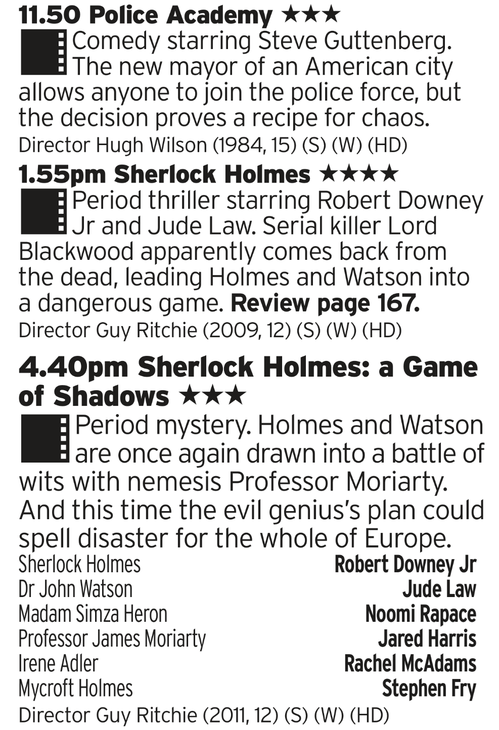 How on Earth do you have Police Academy on at 1150 in the morning? How, what will be left of the film to put on? Its on in the schedules for 2 hours, even with adverts that much mean most of the film is there. But will it? Will it really? I just checked the BBFC website and its a 15, how do you get that on at 1150 in the morning? If you can’t tell this properly intrigues me. And we’ve seen Sherlock before but here it is back to back with the sequel just in case
