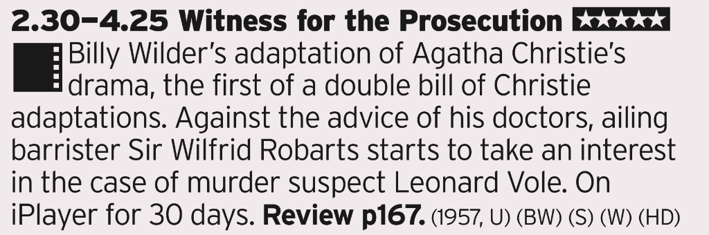 Another Christie double bill, this one has a great turn by Albert Finney, which for a fair old while was the definitive version of Hercule Poirot. And never heard of that first one, by its directed by Billy Wilder so it’s bound to be a belter
