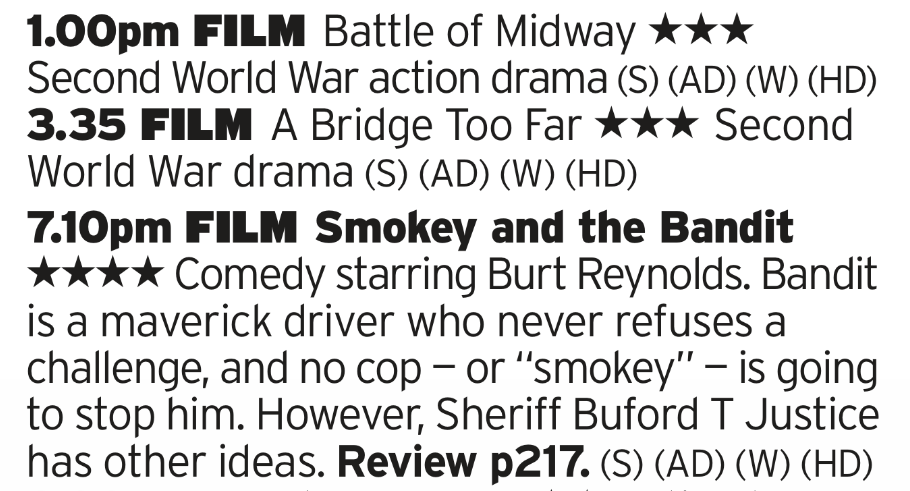 Here’s another pair of great WWII films, dealing with the horrors of that conflict which are followed by Smokey and the Bandit. I mean. Its definitely a choice, I’m not sure if its the best film to follow the story of Operation Market Garden and its many failures but there you go