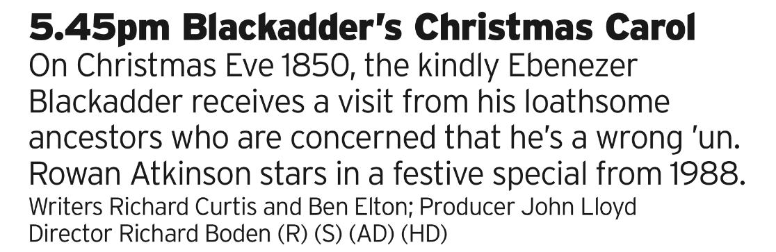 Here’s a great take on the Christmas Carol concept; adding the Blackadder character and giving the story a great big twist so rather than a naughty man becoming nice, a nice man becomes naughty. A perfect fit for the character and excellently told.