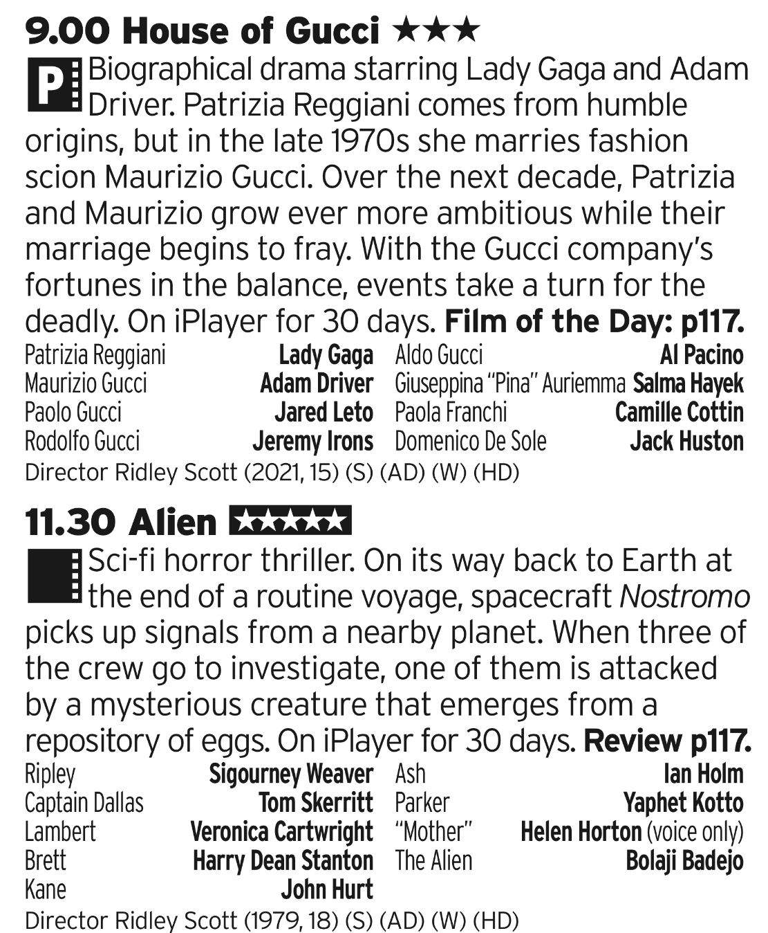 There’s a Ridley Scott double bill for you, one from the early days to a more recent one. I think this is in the right order as there’s no way in God’s Green Earth that you can say that Gucci is better than Alien. I mean, have a go, I’ll gladly sub to your YouTube channel if you do but, really, we all know deep which is the best