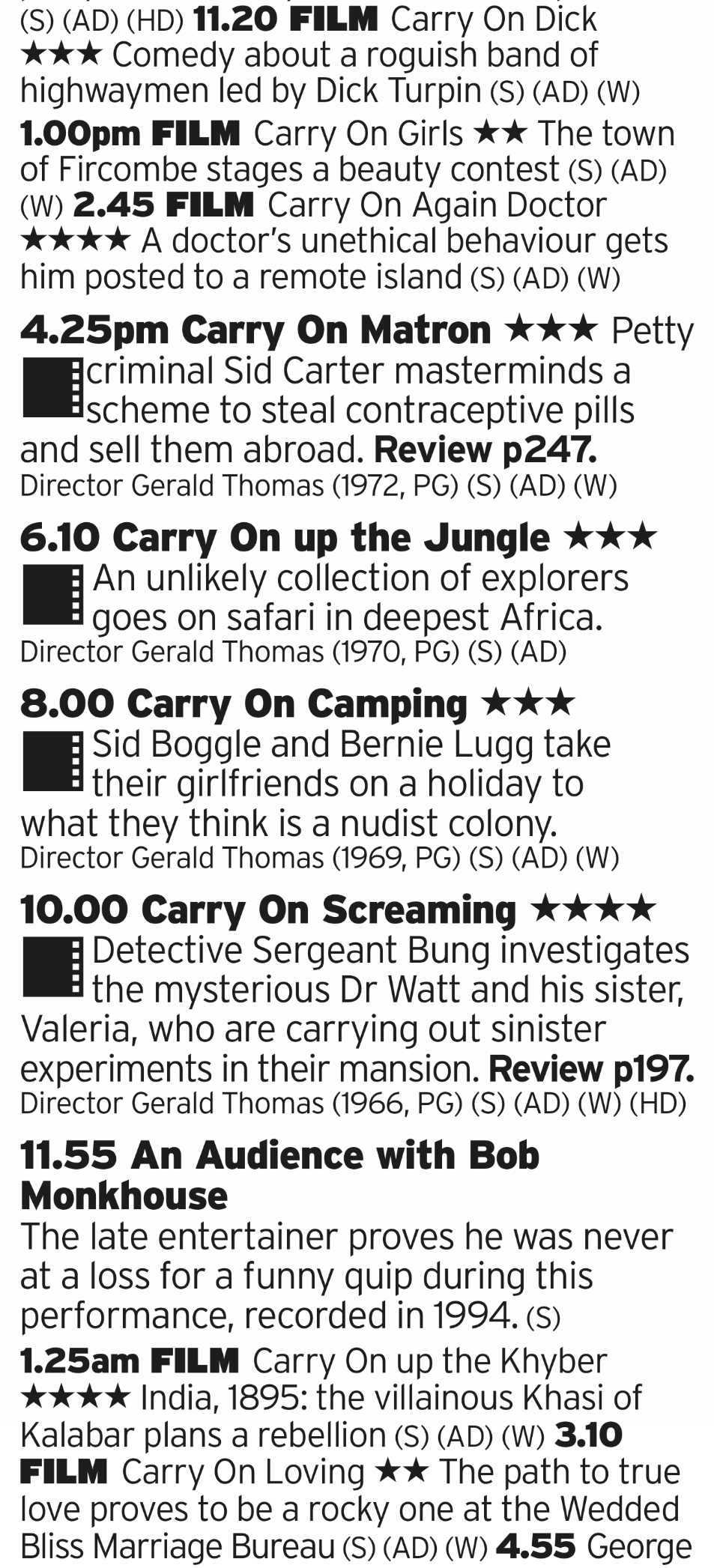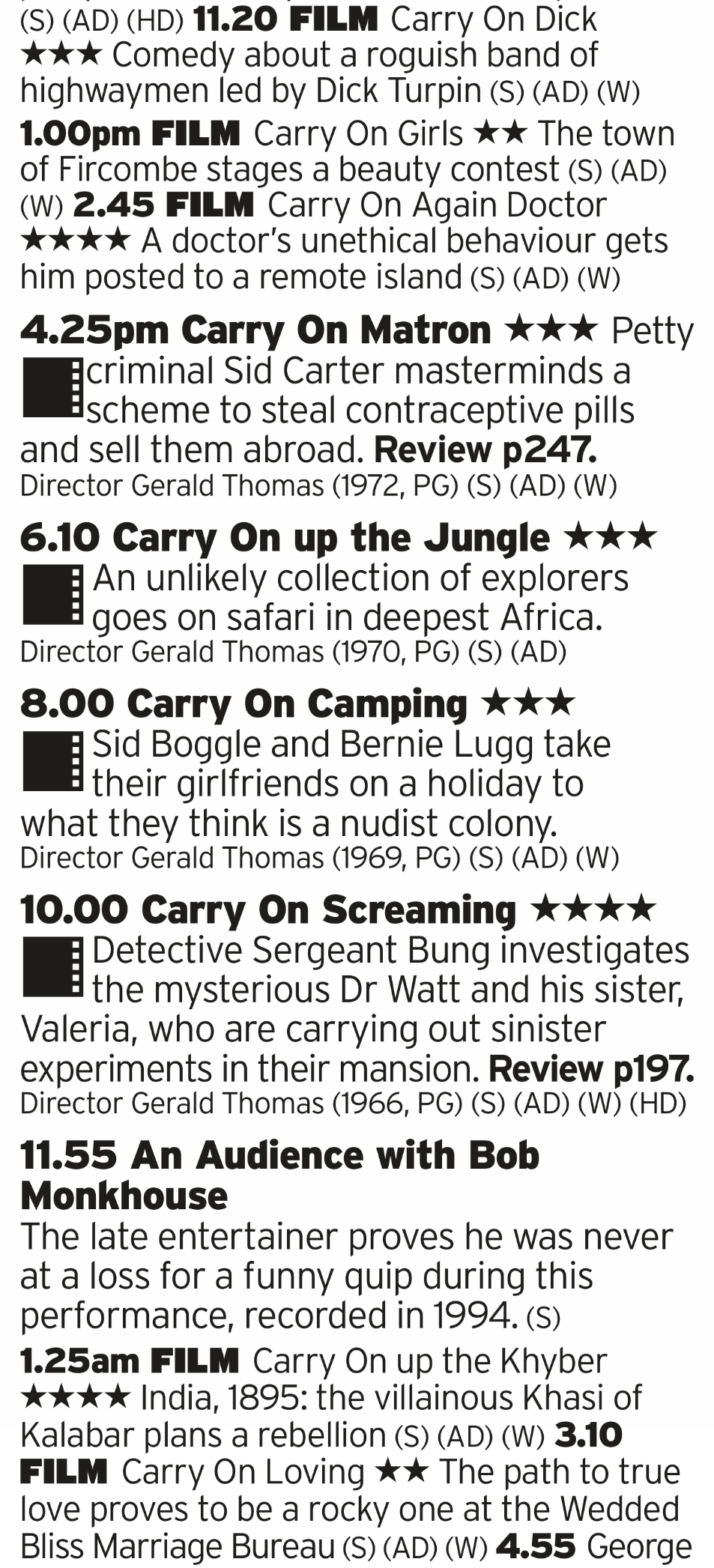 There’s generally a day where, if you really fancy it, you can spend the whole day watching Carry On films and, well, here it is on New Year’s Eve. For my money the best two here are Screaming and Khyber but you take your pick. And you also get a random Bob Monkhouse show in the middle which should be a fun watch as well