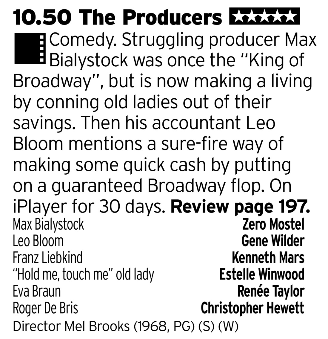 So here we are then, at the point of deciding what to watch when midnight strikes and the New Year begins. If you don’t fancy any big show then this wouldn’t be a bad shout, a great comedy with a superb manic turn from Gene Wilder. Much superior to the remake of a few years ago.