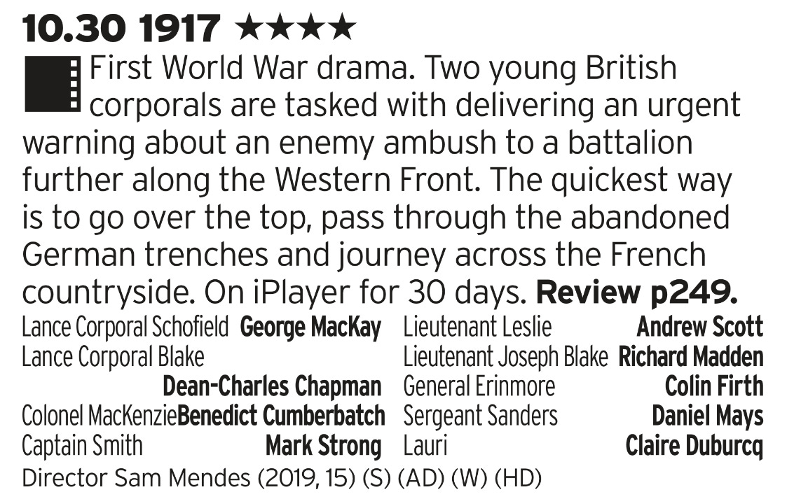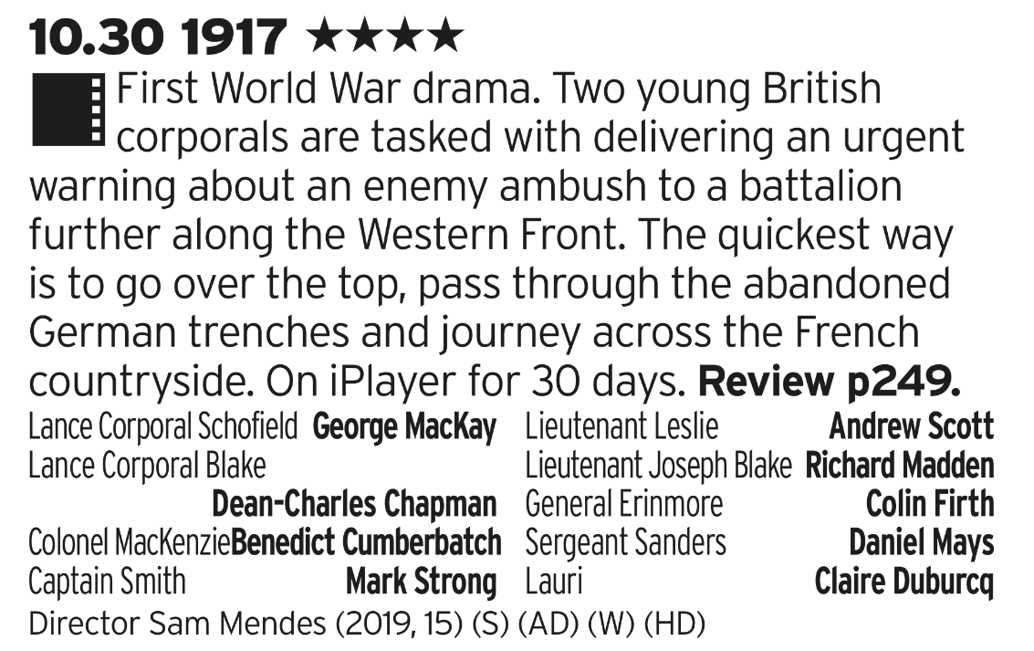 As time passes this film and its big “all in one shot” schitck seems more like a one trick pony. After that initial trip across No Man’s Land and the trenches it feels like the film has wrung all the tension it can out of the setting, but you still have about an hour or so to go. Its still really good, with every random english actor you can think of showing up at least once