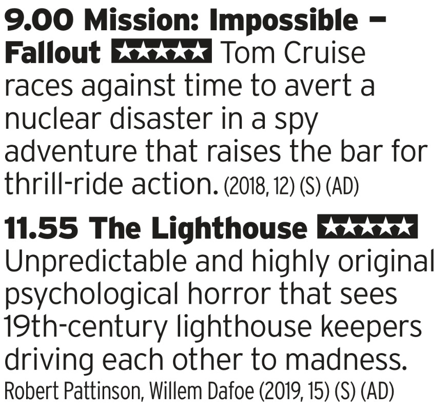 A wild double bill here; remember when I said Fallout was the best of the Mission Impossible series? Well, here you go, proof. Its a big, bombastic, crazy action film and I love it. Then, if you can deal with the immense tonal whiplash, you then get to see Robert Pattinson and Willem Defoe going absolutely bonkers trapped in a lighthouse. Brilliant!