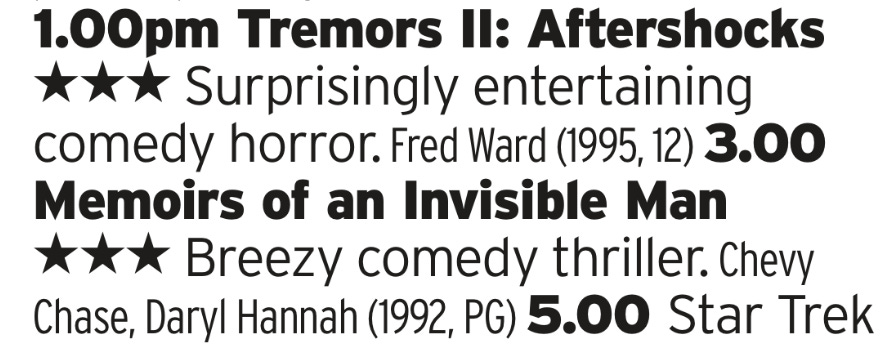 Another double bill, this time of slightly lesser quality! That might sound a bit harsh as both are decent films; Tremors II loses Kevin Bacon and a bit of the surprise of the first film but the charm is still there which keeps the energy going. Then Memoirs is, well, it is a John Carpenter film but from the tail end of the career. Its not helped by a grump Chevy Chase performance but, despite Carpenter himself not doing it, the score is an absolute banger much better than the film actually deserves