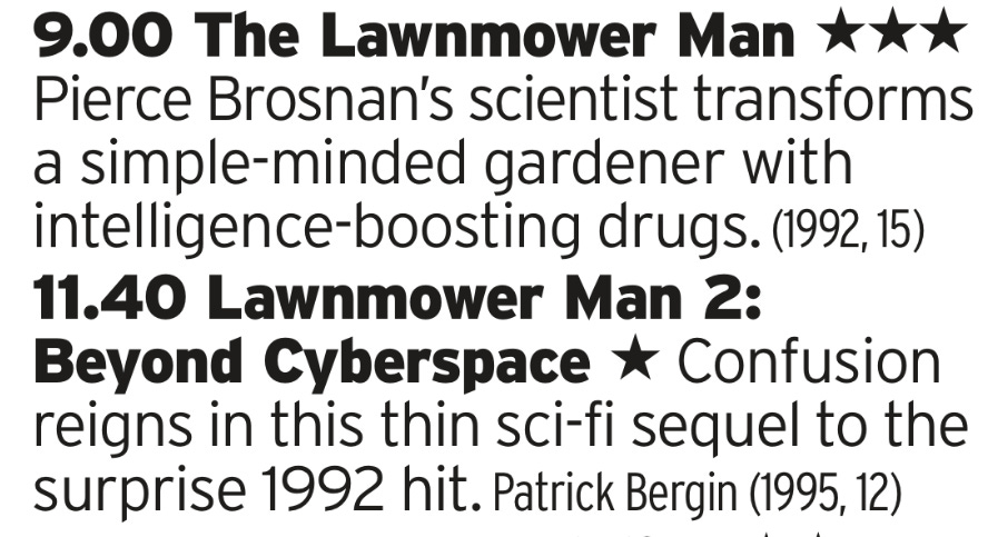 I mean, if you’re going to show Lawnmower Man then you may as well show the sequel straight after it right? Good luck to those willing to deal with this double bill