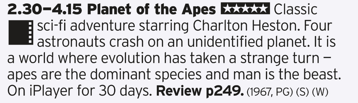 Here’s those damn dirty apes! Not the CG ones we’ve been treated to in recent years, but folks in makeup with Charlton Heston running around in his pants. Oh, its a 60s classic with an ending that pretty much every one much knows by now thanks to the sheer force of cultural osmosis