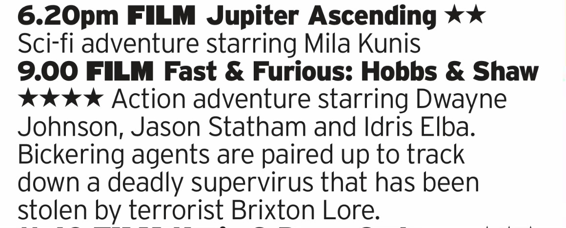 Listen, I don’t think Jupiter Ascending is that bad. Sure its daft, but its supposed to be a big daft sci-fi fantasy film. Thats the kind of stuff you want! I’d certainly take this ahead of the Zack Snyder Rebel Moon stuff. And then you get one of the quippiest films this side of Tango and Cash in the shape of Hobbs & Shaw. Its just as daft as Jupiter in its own way and twice as dumb