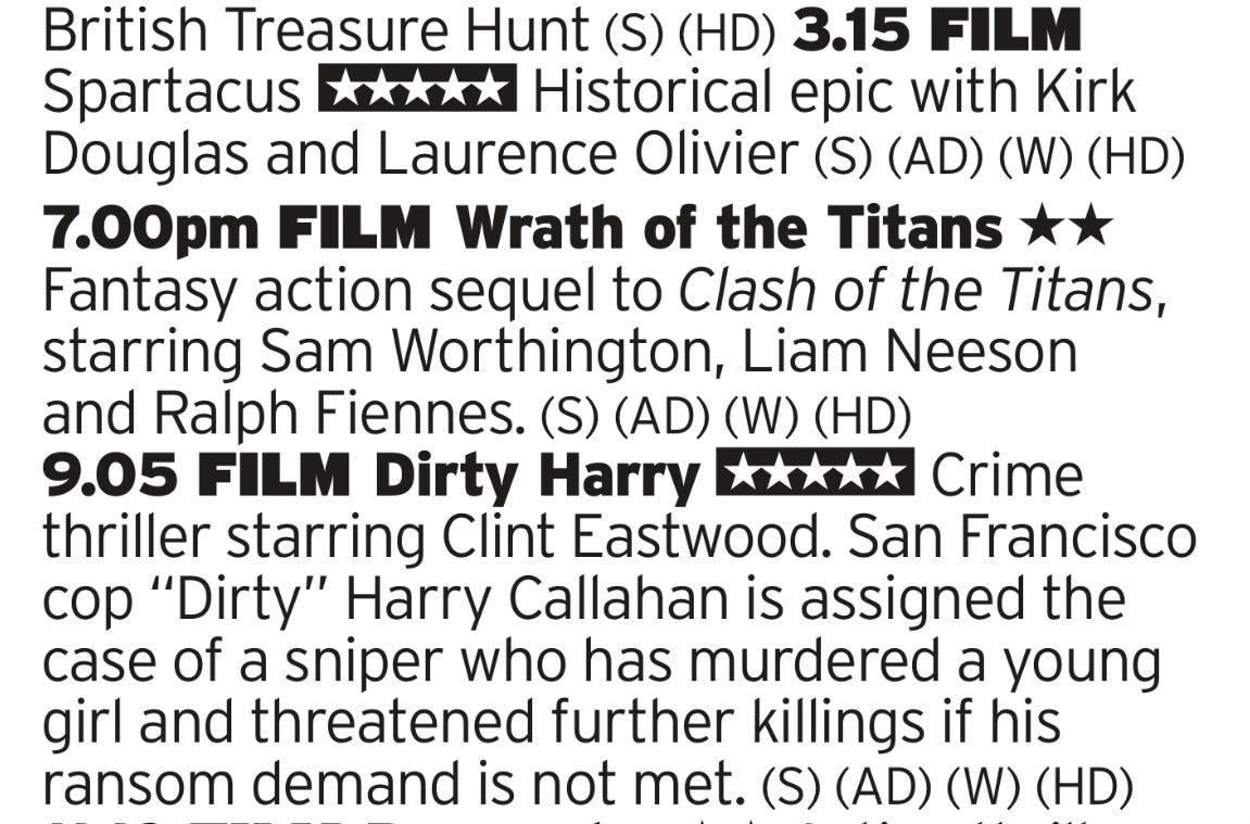 So we have to flag Spartacus just because, again, its another film that companies are legally obliged to schedule during holiday periods because every one loves Kirk Douglas running around battering folks with a sword. Does he batter folks with a sword in this? He must do. And then if you thought that we didn’t need a remake of Clash of The Titans then oh boy did we not need a sequel. But we got one! Oh yes we did! And then for your Daily Eastwood we get the best of the Dirty Harry films with, well, Dirty Harry. Its a banger just based on his knitwear and jacket combo, the man is a fashion icon