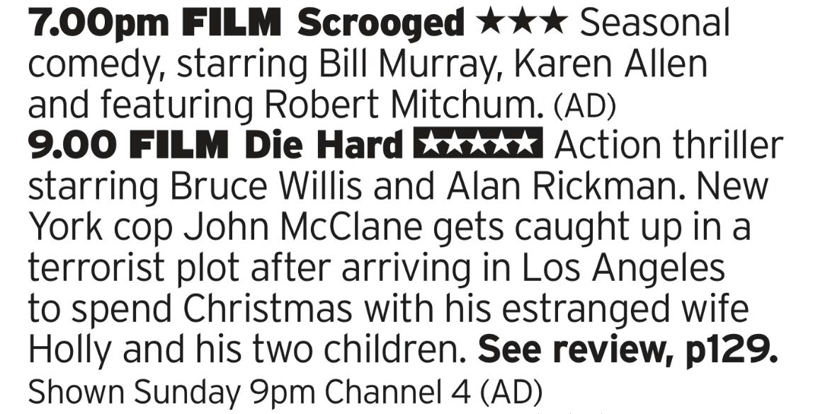 More faultless work from Channel 4 here, well 4Seven, with 2 of the very best Christmas films back to back, Scrooged deserves way more that the 3 stars above, well 2 stars more really. And then Die Hard! We all know its not Christmas until Hans hits the floor of Nakatomi Plaza so this is the best way to see in Christmas Night