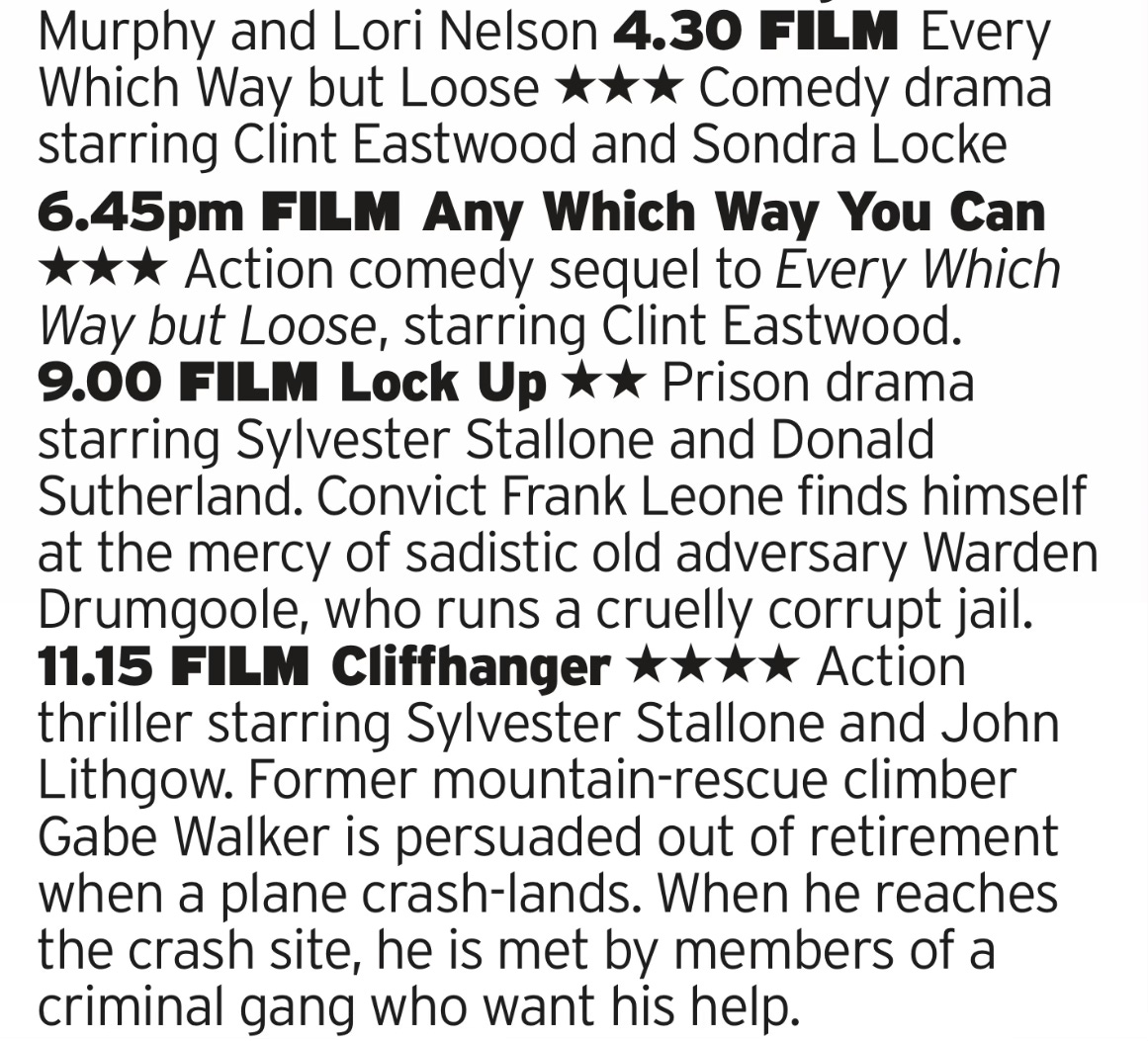 Back to back Eastwood, with his two comedy capers that combine the world of ape care, street fighting and motorcycle gangs. Who knew that was the recipe for comedy success? Then you get back to back Stallone, from both ends of his spectrum; Lock Up is one from the bottom of his list, not a great prison film but one with a good bad guy turn from Donald Sutherland. And then you get one of his absolute bangers with Cliffhanger which rhymes with banger which just shows how much of a banger it is.