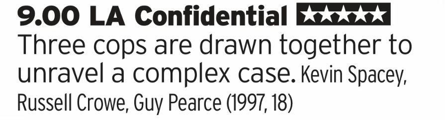 A banger of a film, slightly marred these days thanks to the presence of Kevin Spacey in the cast list. Putting that to one side, this is a great crime film, still the best adaptation of a James Ellroy novel and one of the best films of the 90s. It really is that good!