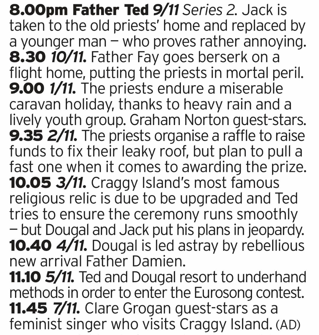 You’d have thought that the Father Ted Christmas special would be here, but nope that was earlier in the week before the Strategy Guide started. Instead, have the entirety of the second series. The whole thing. No clue why they aren’t in the right order but there you go