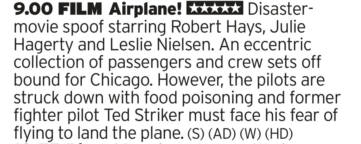 Very much a product of its time, this still has six or seven perfect jokes. The walk into the airport with the charity folk? Double sunglasses? Leslie Nielsen in general? The very definition of “a hoot”