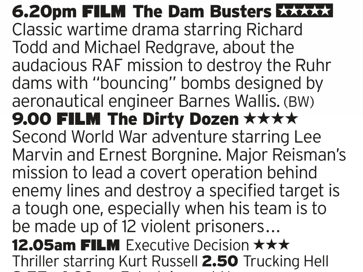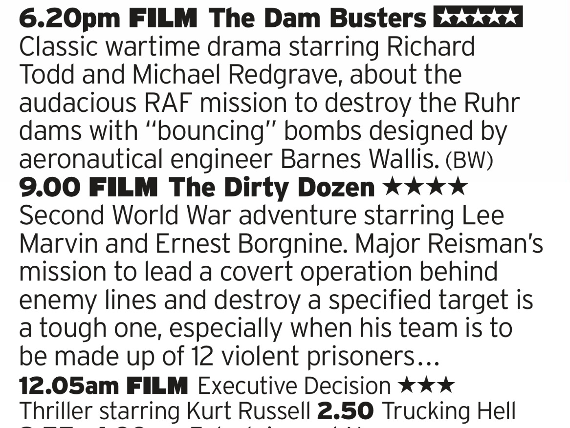 Fairly sure we’ve already had Dirty Dozen before but need to include it here to compete a pretty good triple header; two great War films, the first being a bit more triumphalist that the more cynical near grindhouse tone of Dozen. After that you get another great 90s Dad Action film, with Kurt Russel versus terrorists on a plane.